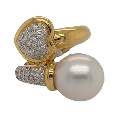 18k Bypass ring with 12mm South Sea pearl and 0.81 carats of pave set round diamonds 13.24 grams size 6.75