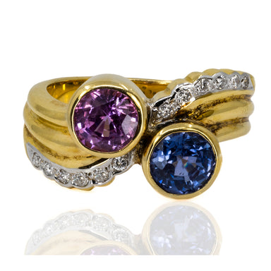 Hand fabricated ring by Keith Davis containing one round blue sapphire weighing 1.25 carats and ne round pink sapphire weighing 1.13 carats and 12 ...