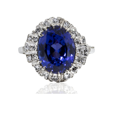 14k White gold antique ring set with one GIA certified 5.22 carat oval Tanzanite measuring 11.30 x 8.65 x 9.96 and 22 round dioamonds weighing app...