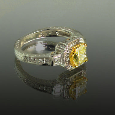 14k Ring with 1.03 radiant cut Yellow Diamond and 32 round & 2 princess cut diamonds weighing approximately 0.40 carats 5.11 grams size 6.5