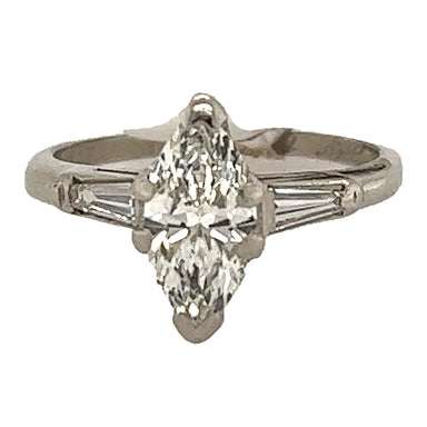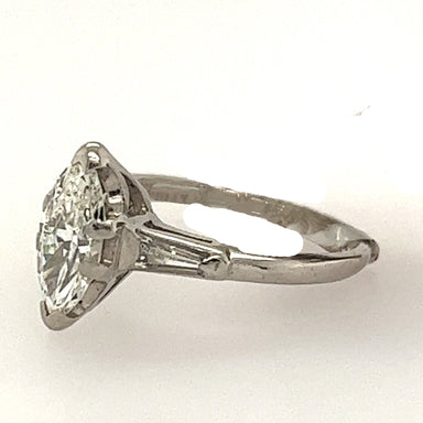 Vintage platinum ring with 0.89 carat GIA certified I color VS1 clarity marquis cut diamond and 2 baguette diamonds weighing approximately 0.12 car...