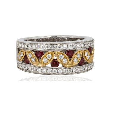 This 14k white and rose gold ring features 7 rubies weighing 0.58 carats and 66 round diamonds weighing 0.61 carats, totaling 8.05 grams.