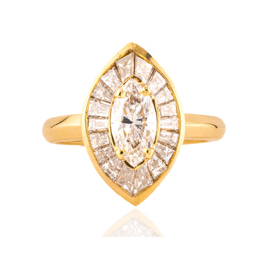 18k Ring rith GIA 0.76 carat E color SI2 clarity Marquis cut diamond and 18 tapered baguette cut diamonds weighing approximately 1.00 carats. 5.24g