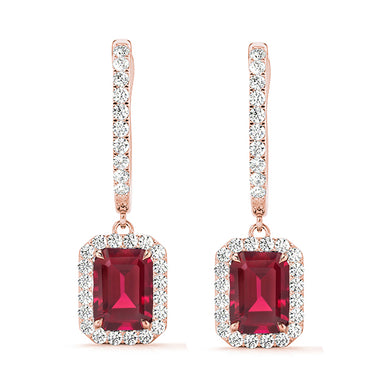 14k Rose gold earrings with2 emerald cut Rubelite Tourmalines weighing 3.84 carats and 64 round brilliant diamonds weighing 0.30 carats. 5.44g