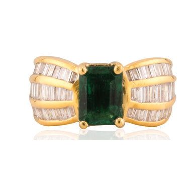 18k Ring with one emerald cut emerald weighing approximately1.50 carats and 66 baguette cut diamonds weighing approximately 1.35 carats. 7.32g Size...