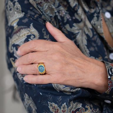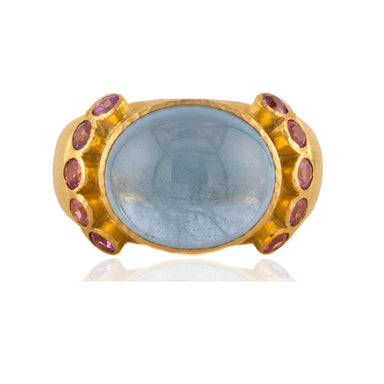 Elizabeth Locke 19k ring with cabochon Aquamarine and 10 round pink sapphires. 12.22g, Size 6.25