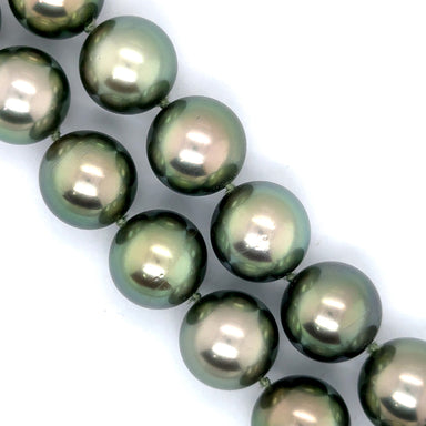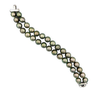 Double strand bracelet containing thirty-two 11.8mm AAA quality Peacock color Tahitian pearls. 8" long. 14k white gold clasp. 75.40g