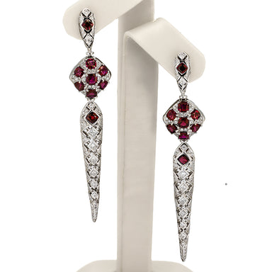 18k White gold earrings with 18 GRS certified "Vivid Red" no heat rubies weighing 5.36 carats and princess cut and round brilliant diamonds weighin...