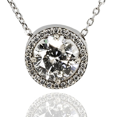 14k Halo Style necklace with GIA certified 1.07 carat H color I1 clarity round brilliant and 0.12 carats of smaller round diamonds.