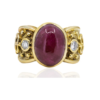 Experience true luxury with the exquisite 18k ring handmade by Keith Davis. Adorned with a lustrous 12.33 carat cabochon Burma ruby and 2 sparkling...