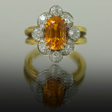 18K and platinum ring by Keith Davis set with one 3.98 carat orange sapphire and 24 round diamonds weighing 0.88 carats. 11.29 grams size 6.5