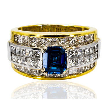 14K two tone gold ring with one emerald cut sapphire weighing 1.05 carats and 30 princess cut diamonds weighing 3.06 carats. 13.87 grams