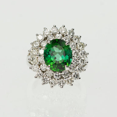 14k White gold ring set with 1 oval green tourmaline weighing 4.30 carats and 34 round diamonds weighing approximately 2.25 carats. 10.30 grams