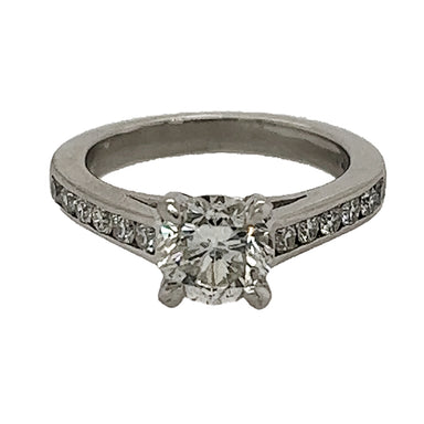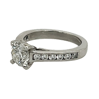 14k White gold ring with one GIA certified (#2231091292) F color I1 clarity, 1.01 carat round brilliant and 0.89 carats of pave set round diamonds.