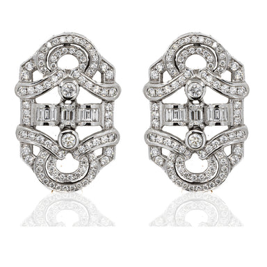 18k White gold earrings with 172 round, 12 bagueete and 2 emerald cut diamonds weighing approximately 4.50 carats. 14.78 grams
