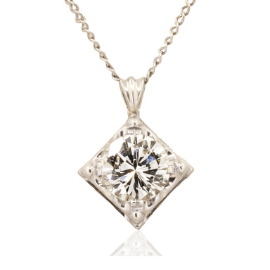 14k White gold vintage solitaire pendant set with one appoximate 1.50 carat round diamond on 18" white gold chain.3.45 grams