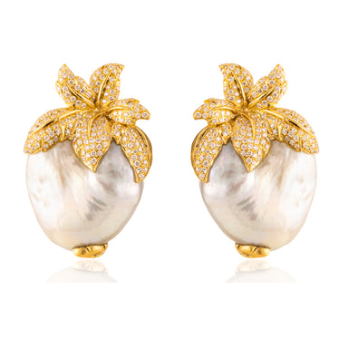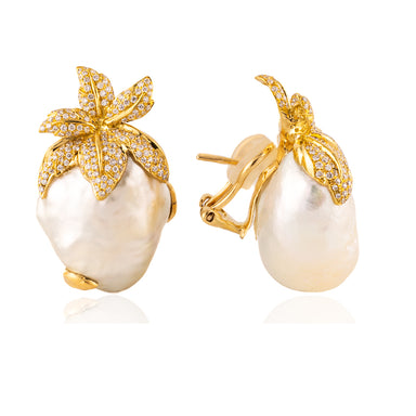 18k Earrings with two free form silver white South Sea pearls measuring 30x22x17mm and 330 round diamonds weighing approxiamatly 2.50 carats. 30.27g