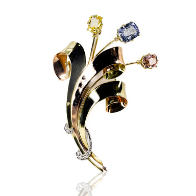 14K Retro Period Tiffany & Co. Brooch with 3 AGL cerified no heat sapphires (pink=3.50ct, yellow= 3.75ct, blue=6.02ct) weighing 13.27 carats to...