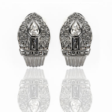 14k White gold earrings with 3 pearshape diamonds weighing approximately 0.85 carats and 16 bagutte cut and 64 round brilliant diamonds weighing ap...