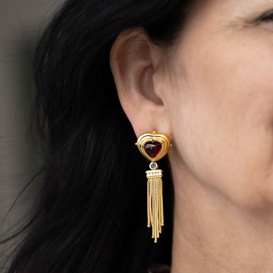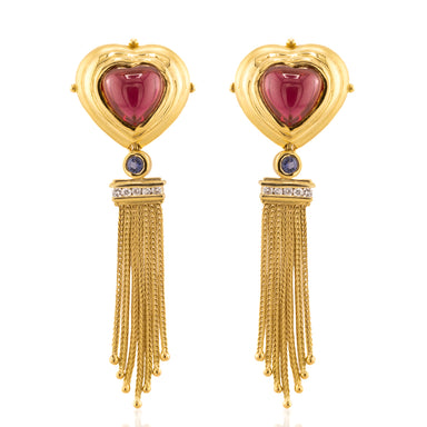 Seidengang 18k Etruscan revival style drop pair of earrings two heart shape cabochon rubellite tourmalines weighing approximately 10.00 carats and...