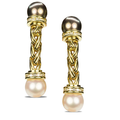 18k Earrings with one Tahitian and one South Sea pearl and 1.28 carats of round diamonds.