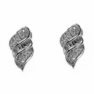 14k WHite gold earrings containg 38 rouind brilliant and 10 straight baguette diamonds weighing approximately 2.00 carats total weight. 12.67 grams