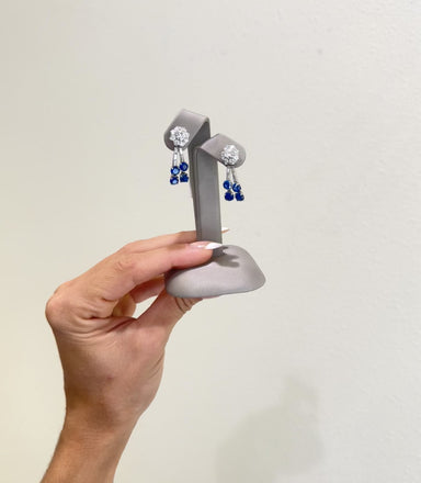 18k WHite gold earrings with 2 South Sea pearls measuring 13-14mm and 106 sapphires weighing 3.07 carats and 26 diamonds weighing 0.45 carats. 14.2...