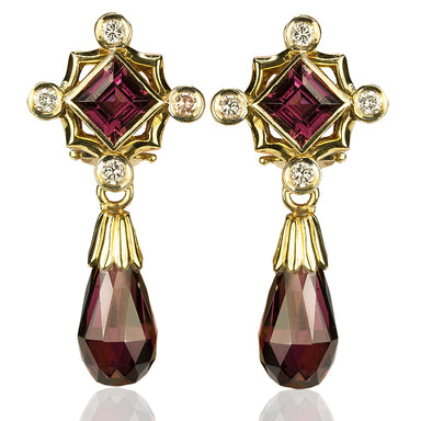 14k Earrrings with 4 rhodolite garnets and 0.34 carats of round diamonds. 11.32 grams