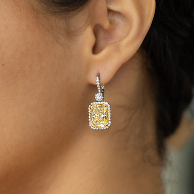 18k Earrings with 2 radiant cut light yellow diamonds weighing 10.36 carats and 1.19 carats of round white diamonds.