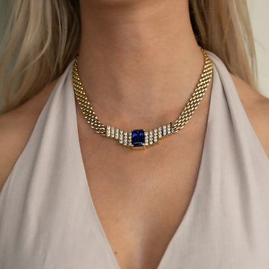 14k Necklace with one emerld cut Tanzanite weighing 17.85 carats and 42 round brilliand diamonds weighing 5.95 carats. 75.05g