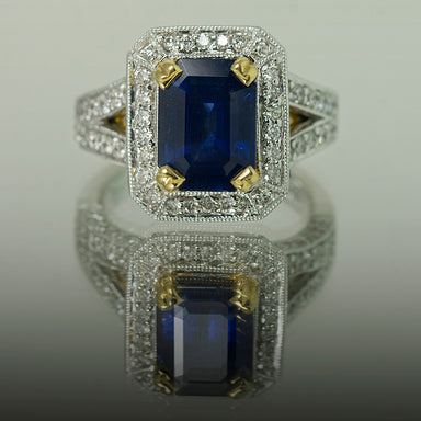 14K two tone gold ring with one emerald cut sapphire weighing 1.05 carats and 30 princess cut diamonds weighing 3.06 carats. 13.87 grams