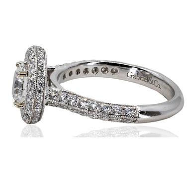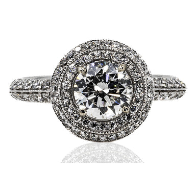 14k White gold ring with one GIA certified (#2231091292) F color I1 clarity, 1.01 carat round brilliant and 0.89 carats of pave set round diamonds.
