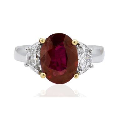 Platinum & 18k Ring with one 3.09 carat AGL certified ruby and 2 half moon diamonds weighing 0.78 carats. 7.90 grams.
