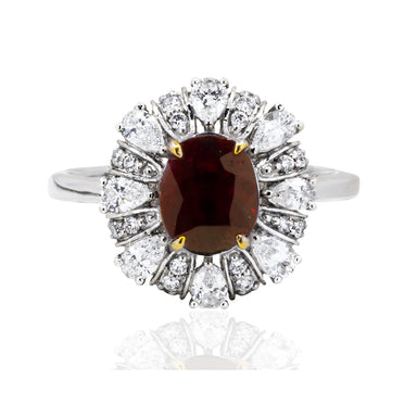 View full detailsRuby ring with GRS ceritified 1.48 carat Burma No Heat Vivid Red Ruby and 8 pear shape and 16 round diamonds weighing approximately 1.25 carats. 5....