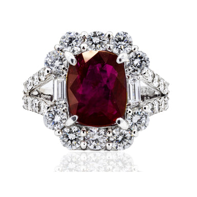 Platinum ring with GRS certified 4.13 carat Burma ruby and 26 baguette and 5 round diamonds weighing approximately 1.25 carats. 11.56 grams