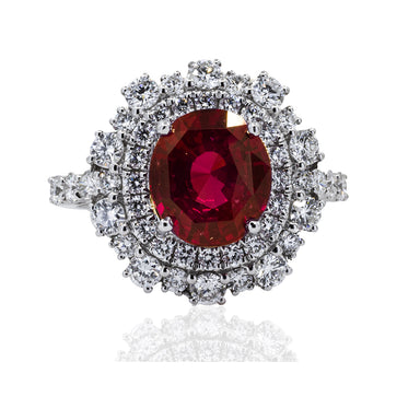 18k White gold ring with AGL certified 3.55 carat no heat ruby and 46 round iamonds weighing weighing 1.26 carats. 6.01 grams size 6.5