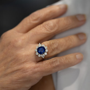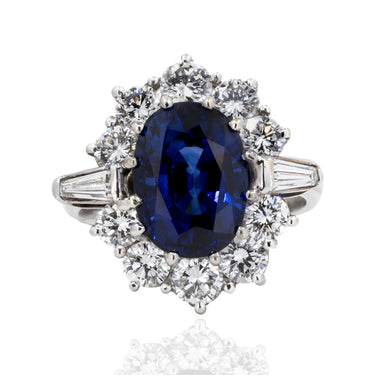 18k White gold ring with 6.37 carat royal blue sapphire weighing 6.37 carats and 2.21 carats of fine diamonds. 8.02 grams