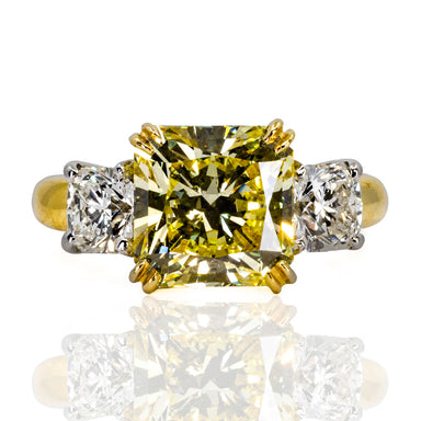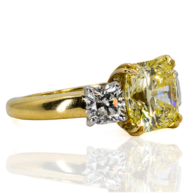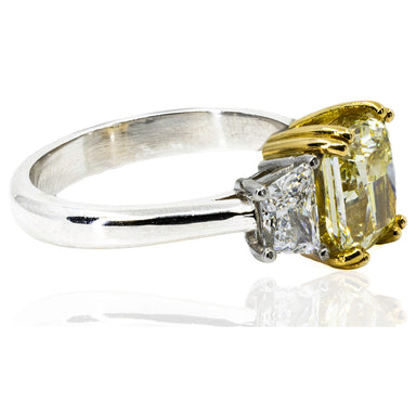 18k & Platinum Ring with one 3.72 carat Natural Fancy Intense Yellow, VS1 square radiant cut diamond and 2 flanders cut diamonds weighing 1.29 ...