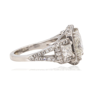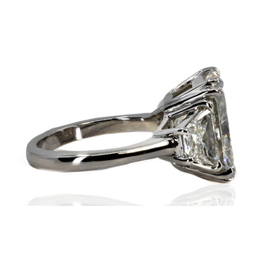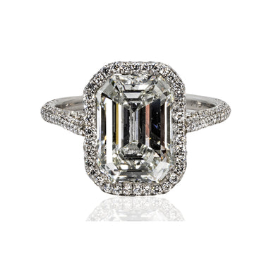 Platinum ring with GIA ceritified 5.37 carat J color, 100% eye clean SI2 clarity emerald cut diamond and 1.51 carats of pave set round diamonds. 6....