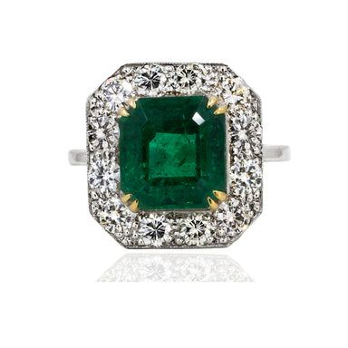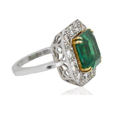 Hand fabricated platinum ring by Keith Davis containg one 5.29 carat fine emerald and 12 round brilliant diamonds weighing 1.68 carats. 10.54 grams