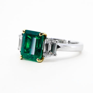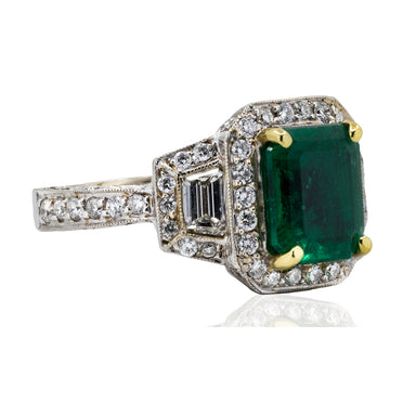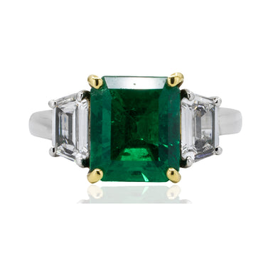 Platinum and 18k ring with top gem 3.88 carat Colombian Muzo emerald and two cloroless sheild cut diamonds weighing 1.02 carats. 9.62 grams