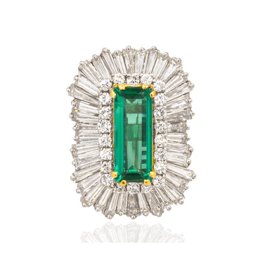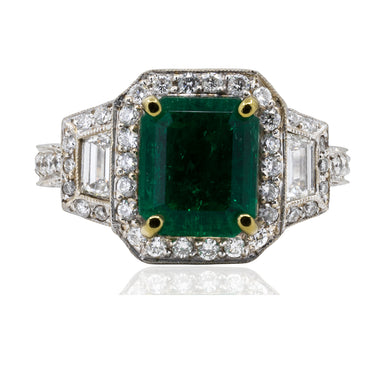 18k White gold ring with one 2.84 carat Colombian emerald and 1.63 carats of round and trapazoid diamonds 10.57 grams