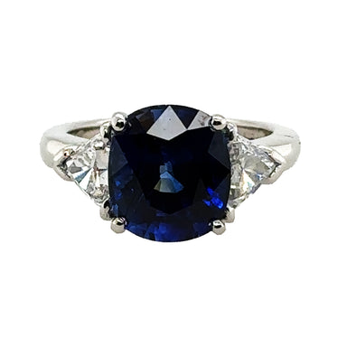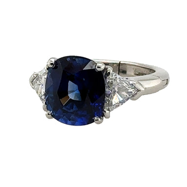 Platinum adjustable shank ring with GIA certified 5.42 carat Royal blue sapphire and 2 trillion cut diamonds weighing approximately 1.10 carats. 8....