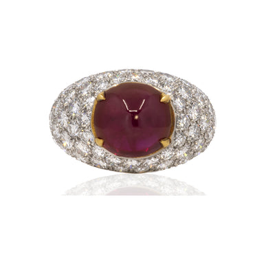 Platinum ring with one 8.61 carat Burma, no heat, cabochion ruby and 3.31 carats of pave set round brilliant diamonds. 10.75 grams, size 6 (sizable)