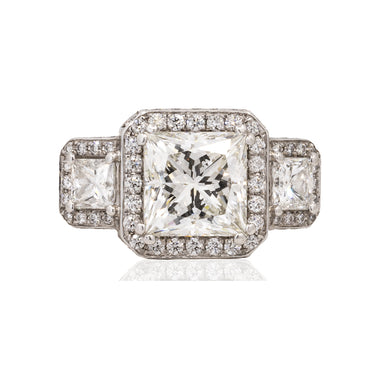 14k White gold ring with one 4.04 carat GIA certified 4.04 carat J color VS2 clarity princess cut diamond (GIA 14810039) and two smaller princess c...