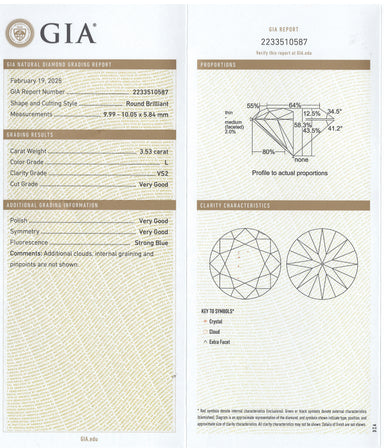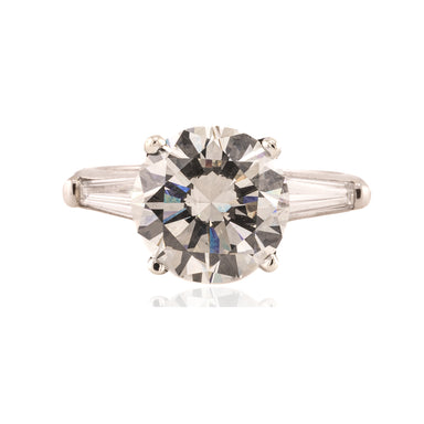 Platinum ring with GIA certified (#2233510587) 3.53 carat L color, VS2 clarity round brilliant and tapered baguettes weighing approximately 0.60 ca...