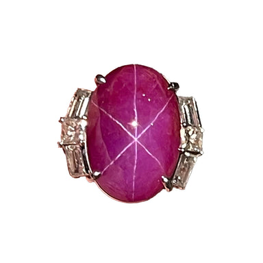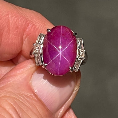 Platinum Ring with one 14.52 Burma Star Ruby and 4 straight baguettes and 2 princess cut diamonds weighing 1.03 carats. 11.83g, Size 6